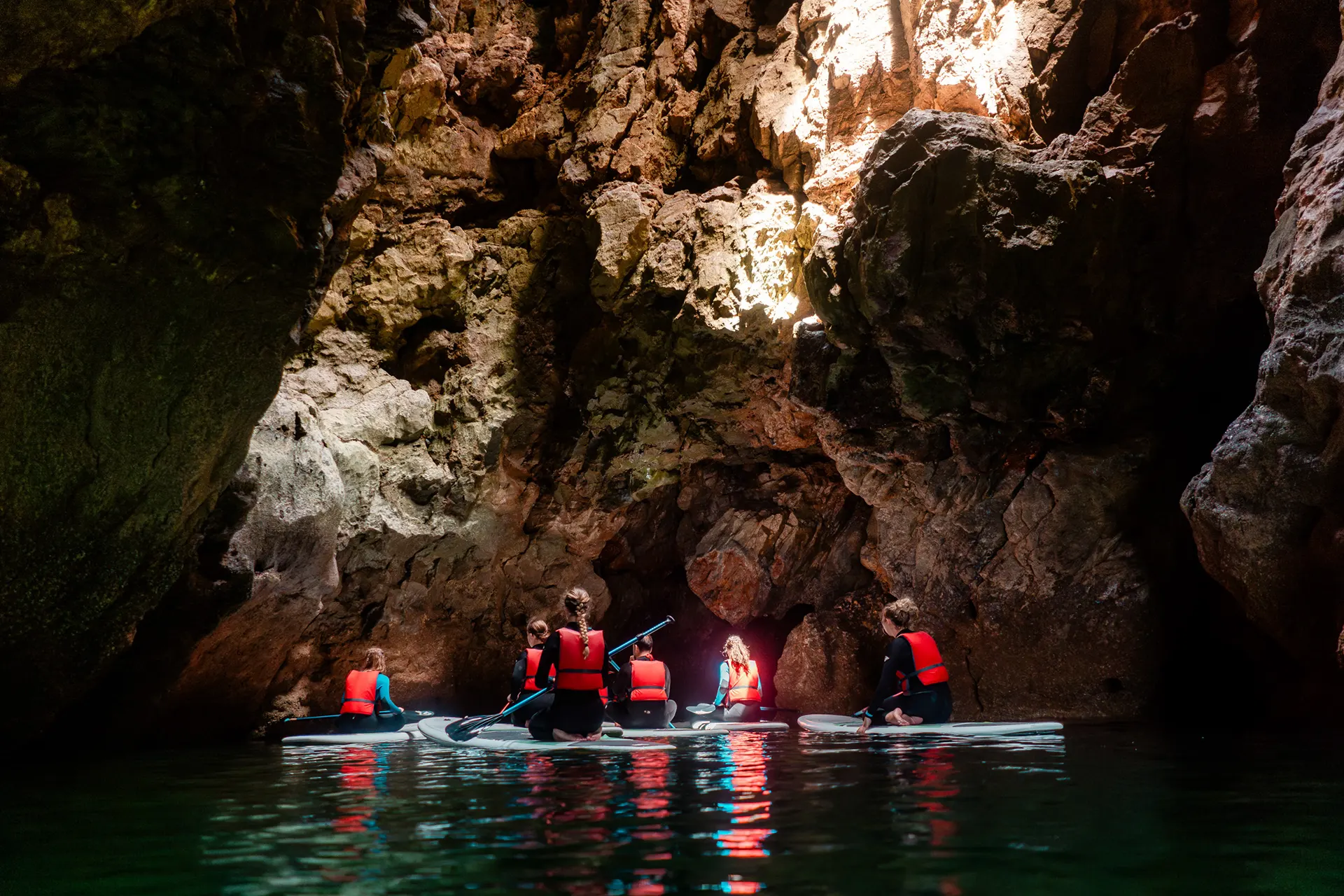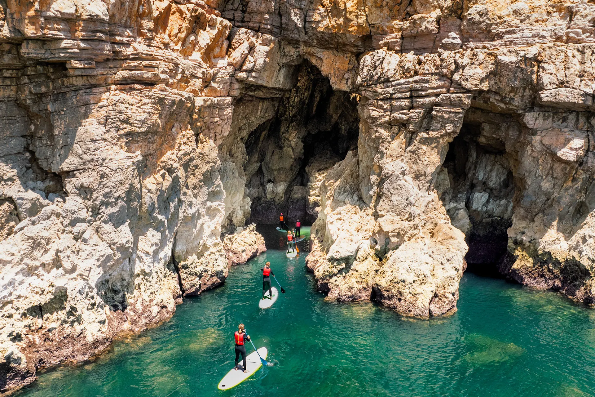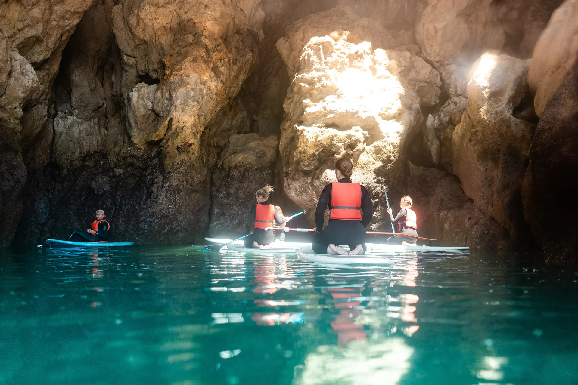 The SUP tours start at Praia do Barranco, a beautiful secluded beach between Lagos and Sagres on the Algarve’s south coast. From there, you paddle towards Ingrina, with stops in the grottos along the coast. The meeting point for the SUP tour is in Raposeira, where you will head to the beach together, then dive straight into the crystal-clear water.